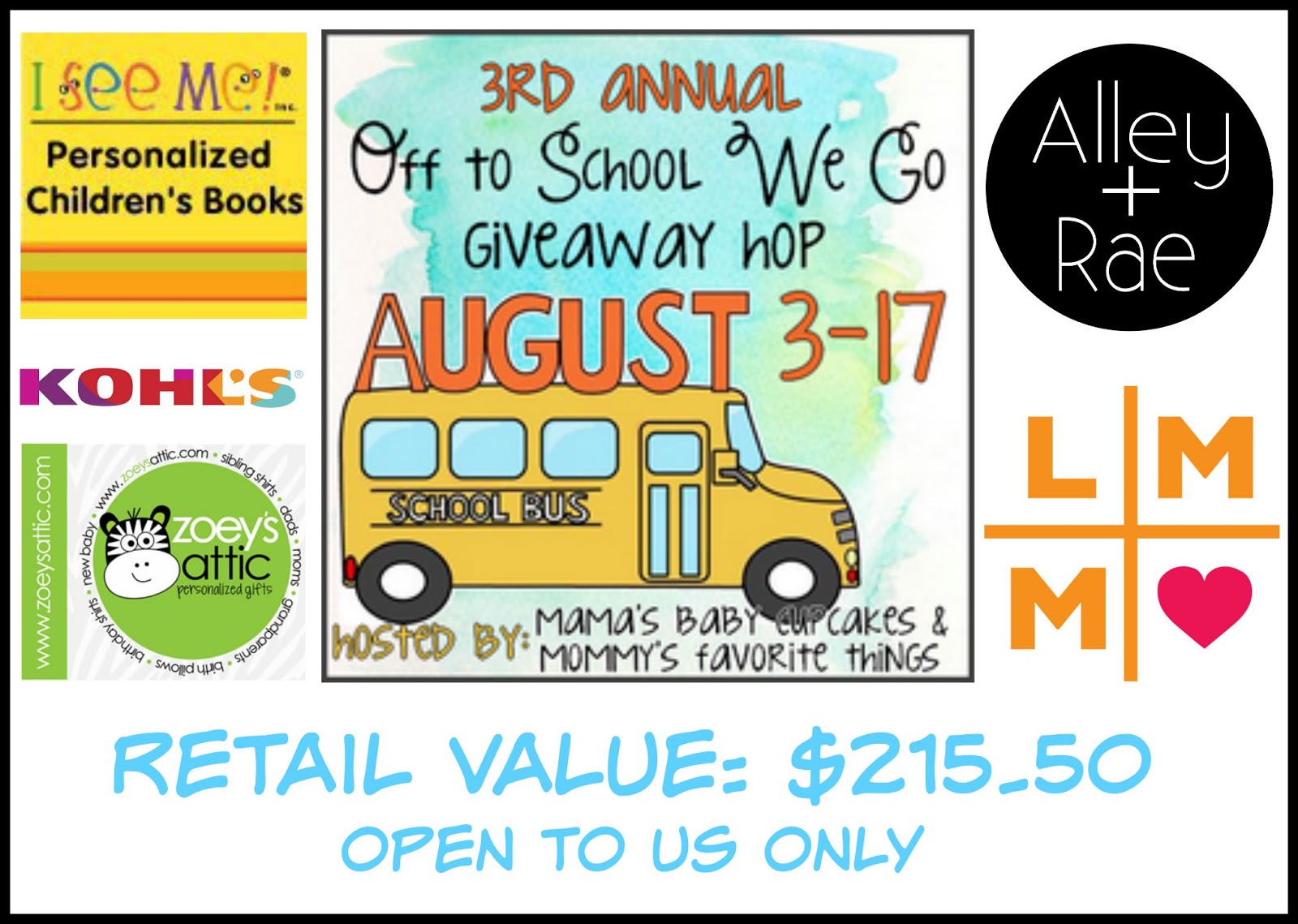 Be sure to check out the grand prize on Mama’s Baby Cupcakes blog for several goodies to get your kiddos ready for another school year! One lucky winner will receive a lunchbox of their choice from I See Me!, one school themed shirt from Zoey’s Attic Personalized Gifts, two fun shirts of your choice from Alley + Rae, a $25 gift card from Little Miss Matched, and a $100 gift card from Kohls. Gift cards are great for extras like book bags, shoes, pants, and more! This grand prize has a retail value of $215.50, perfect for getting ready to go back to school!